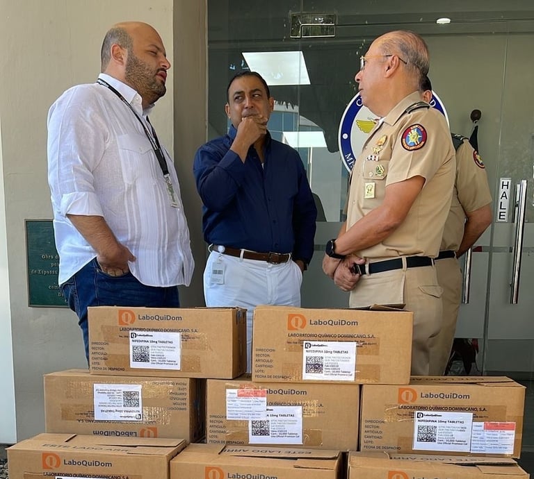 El 5 de marzo de 2025, entregamos 500,000 unidades de antihipertensivos a la Dirección General del Cuerpo Médico y Sanidad Militar, recibidas por el General Salazar y el Capitán Navio Abreu, con la presencia de Hamlet Berges.